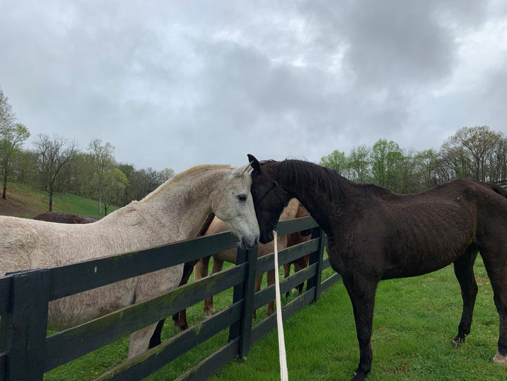 He genuinely LOVES being around kids, and stands alert yet calm whenever they approach and immediately has soft and quiet eyes when they start brushing him. If it was possible to stand and be brushed all day, he would gratefully accept it. He has explored our many "play" objects (a tarp, a tire, small jump, large ball, water bottle pit, umbrella, hula hoops, weaving cones) in the arena and is fearless.He has gained enough strength to be able to be introduced to the rest of the herd and did fantastic. He is now enjoying 24-7 turnout with his pasturemates and getting 10lbs of Triple Crown Senior along with supplements (broken up over multiple mealtimes) each day. We're very grateful to not have to feed him the 35-40lbs of 75%Alfalfa/25%Orchard Grass he was eating each day at the beginning of the month!We'll have an official new weight number for him in June and will be sure to share it with you!