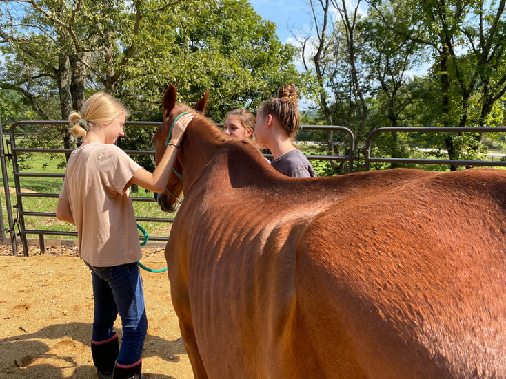 Getting to know Remi has been the most fun part about bringing him in! He quickly realized that people = food! Every time he hears approaching voices and the barn gate open he lets out a loud whinny and will not stop until he gets his food or attention! He is genuinely sweet and curious, gently touching anything you hold out to him with his nose to inspect. Remi enjoys his short walks around the arena to help him build up his strength. He always walks with purpose like he has somewhere important to be. I have also never met a horse who LOVES scratches as much as Remi does. Because of his rainrot, part of our daily routine with him is to rub his back with Coat Defense powder or Equiderma lotion to help it heal. It is his favorite time of day and he will stick his upper lip out, lean his head back, and sway whenever we hit his favorite spot juuuust right. It has been a joy to see him recover and start to thrive in the Ranch environment.