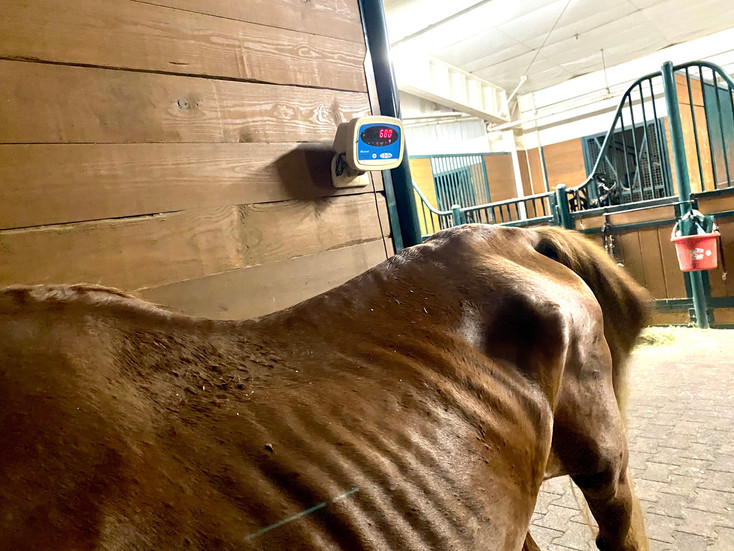 The first month of having Remi has been amazing! From the first night we brought him in, it was clear that he had not known care for a long time. His back was covered in raintrot, hooves were long and cracked, he had ticks and parasites, and his mane and tail were matted into clumps (called "witches brooms"). His teeth are so overgrown that we've been having to soak his feed in water so that he can eat comfortably. Rehabilitating a starvation case like Remi is an around-the-clock job beginning with feeding him every three hours including overnight. Our amazing volunteers have truly outdone themselves by providing that constant care for Remi from the moment he set foot in our barn. The first 24 hours that Remi was with us, he drank a staggering 54 gallons of water! He continued drinking so much water that his ribs started to fill out and he got pockets of water by his armpits! As he rehydrated, the water pockets went away and he drank at a more normal pace. It's crazy to think that he might not have had water for a very very long time before coming to us.