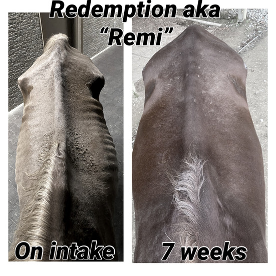 Remi has had the quickest recovery of any rehabilitation case we've had! He hasn't had a single hiccup in his recovery and has only been steadily gaining weight and growing more relaxed. When we first got Remi in, he was restless and would constantly pace around his stall. He was still in survival mode because he wasn't sure where his next meal would come from. Now he is completely relaxed and loves to hang out with people in his stall. He has completely won our hearts. Remi has been excelling in learning his manners especially now that he knows he can trust us. He is so eager to please and works very hard to earn our approval.